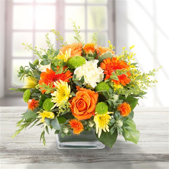 Yellow Roses Orange Roses Cream Carnations Bloom Yellow Solidago Green Spray Chrysanthemums Glass Cube