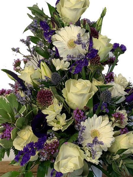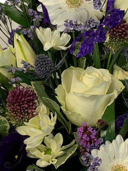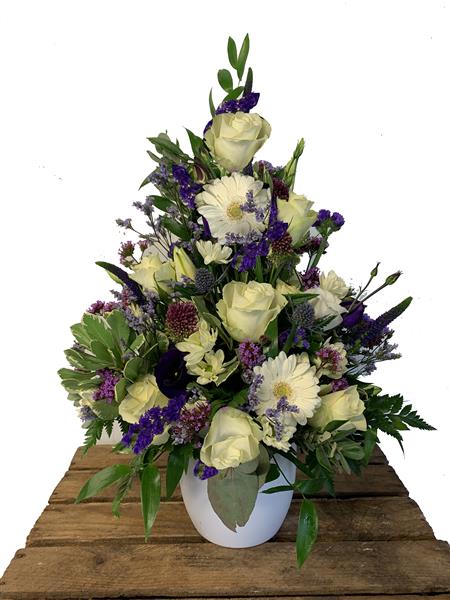 This Vase Arrangement contains Blue Eryngium Purple September Dark Blue Freesia Ivory Roses and Dark Blue Iris all mixed with Seasonal Foliage and Skilfully arranged in a Ceramic Vase.