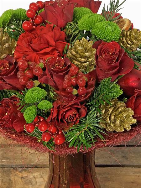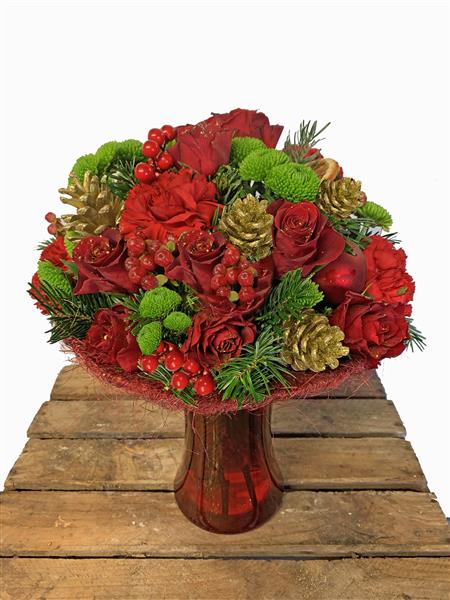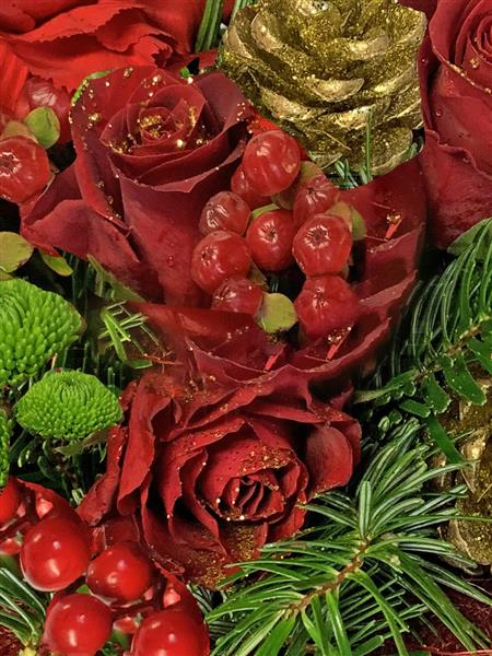 Red Carnation Spruce Berries Gold Cones Red Spray Chrysanthemums Green Spray Chrysanthemums Red Roses