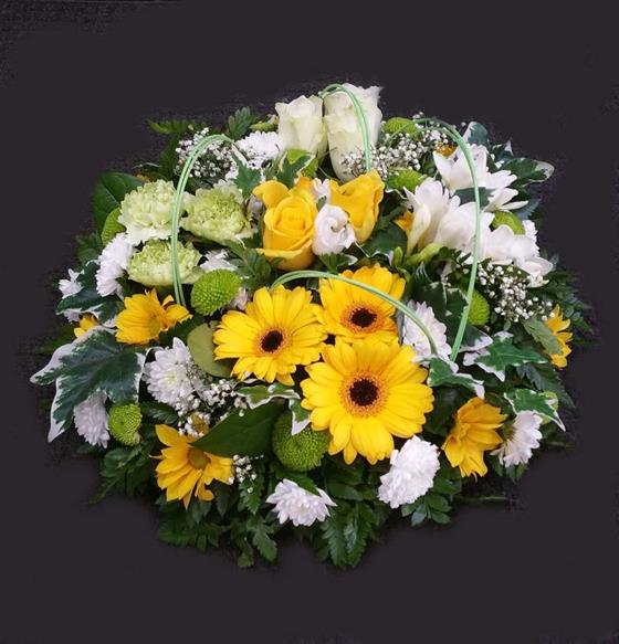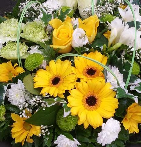 Yellow Roses Yellow Gerbera White Roses White Freesia Green Bloom Carnation Ivy Green Spray Chrysanthemums