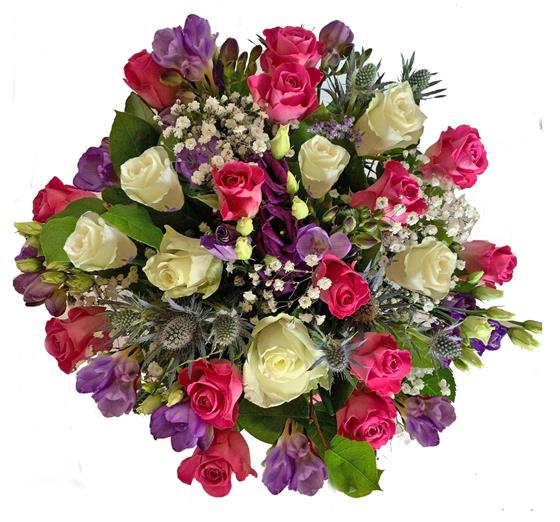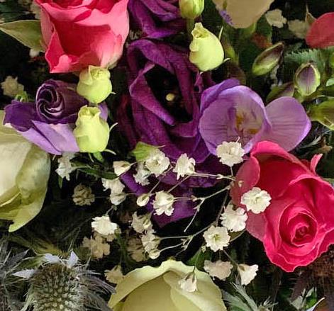 Pink Roses Purple Freesia Purple Lisianthus Gyp Blue Eryngium Ivory Roses