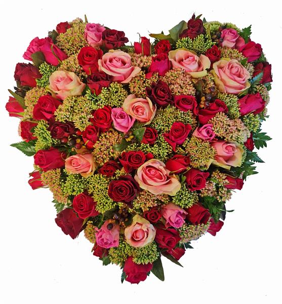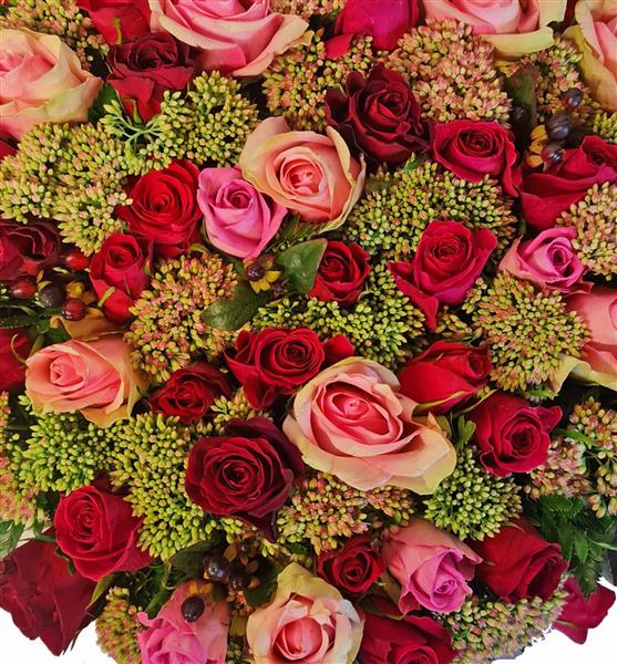 Red Roses Pale Pink Roses Hot Pink Roses Sedum & Leather Leaf