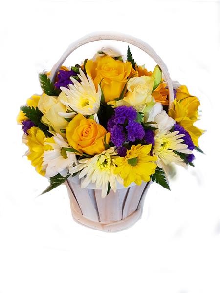 Florist Choice Seasonal Selection Of Colour Co-ordinated Flowers and Foliage Professionally Arrangement and Presented in a High Quality Wooden Basket.