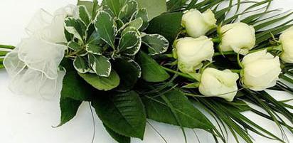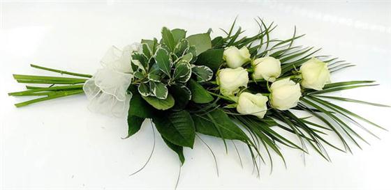A Simple Elegant Funeral Arrangement of 6 x 12 x 18 x Large Headed Ivory Roses Fatsia Japonica Leaves and Phoenix Palm