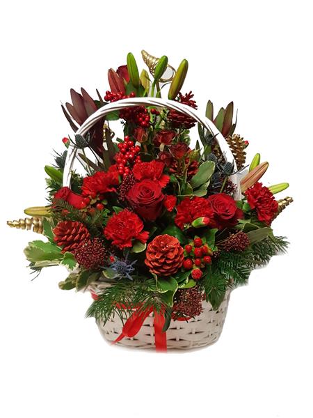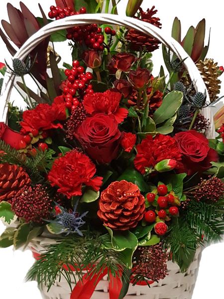 Red Roses Red Carnations Gold Cones Berries 18" Approx High