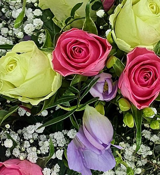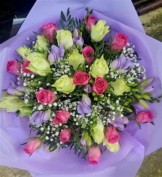 Pink Roses Ivory Roses Gyp Lilac Freesia Mixed Foliage