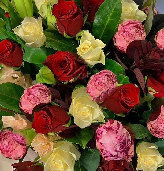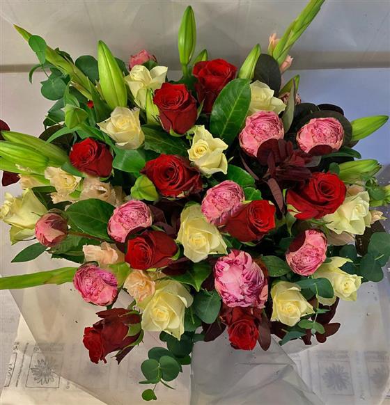 10 x Red Roses 10 x White Roses 5x White Lilies 5 Pink Peonies Mixed Foliage