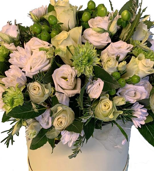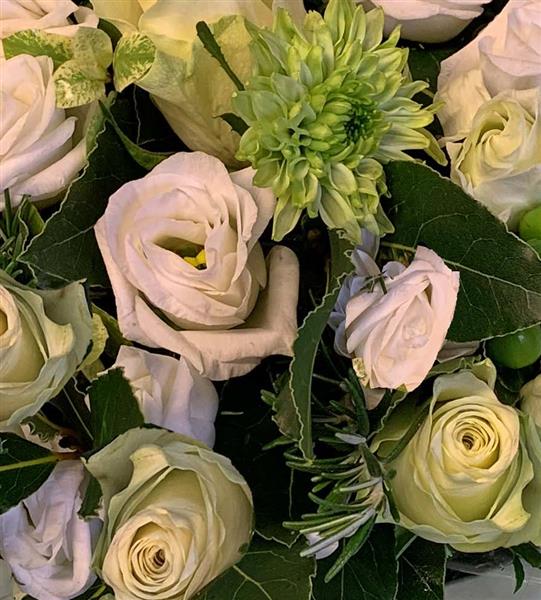 Ivory Roses Green Spray Chrysanthemums Green Hypericum Berries White Lisianthus Bay White Spray Chrysanthemums