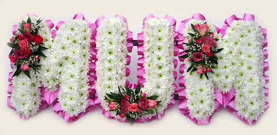 Each Letter is Massed in White Classic Double Spray Chrysanthemums & Pink Rose Posies