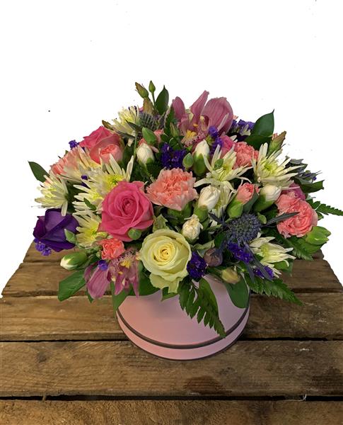 Pink Roses White Roses Spray Chrysanthemums Thistle Lisianthus Purple Limonium