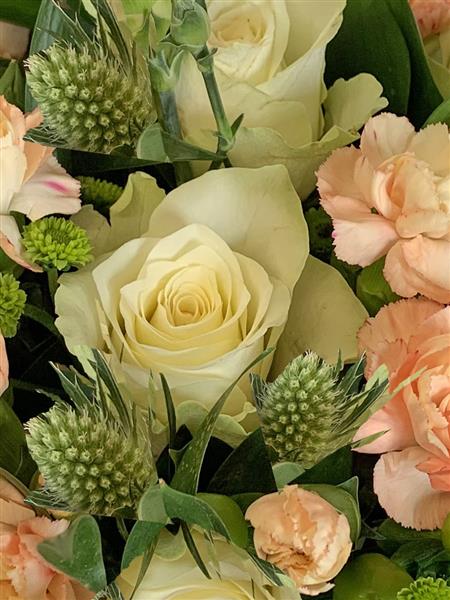 Ivory Roses Peach Spray Carnations Green Thistle