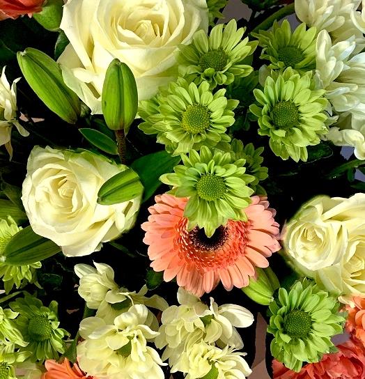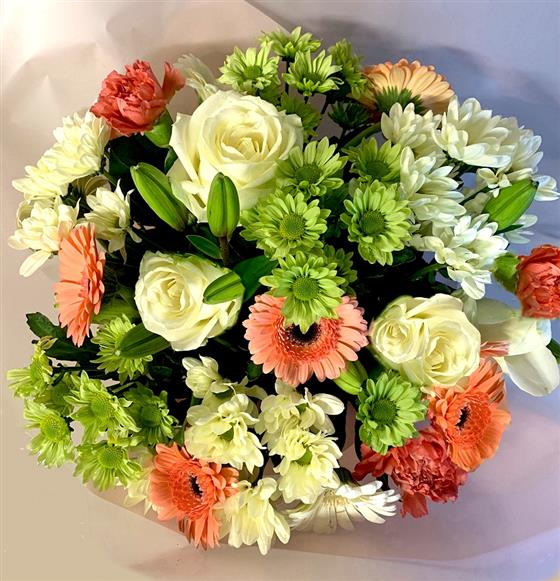 Peach Germini Ivory Roses Ivory lilies Green Spray Chrysanthemums