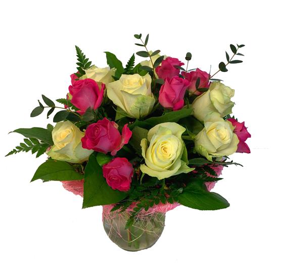 6 x White Roses 6 x Pink Roses Mixed foliage Glass Vase & Pink Collar