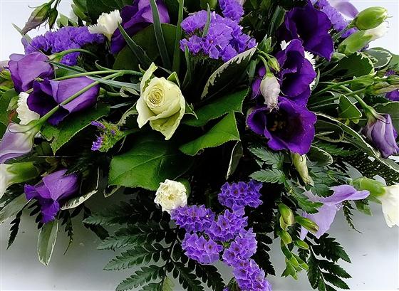 Purple Lisianthus Cream Roses Purple Statice White Spray carnations & Mixed Foliage