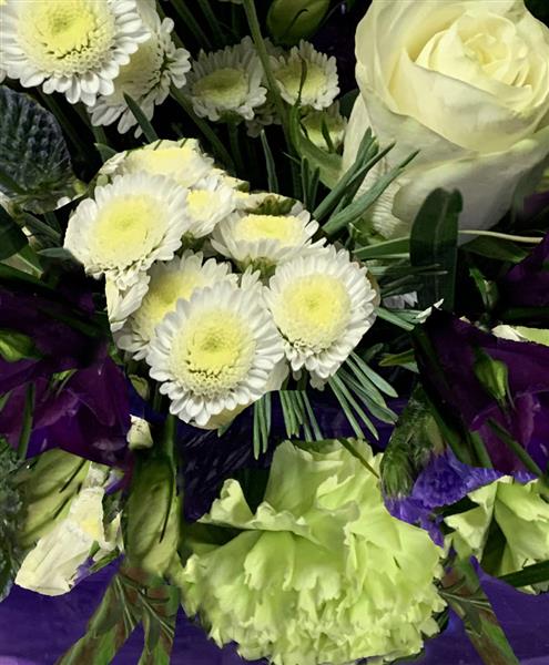Ivory Roses Purple Lisianthus Green Carnation Bloom Thistle Palm Leaves