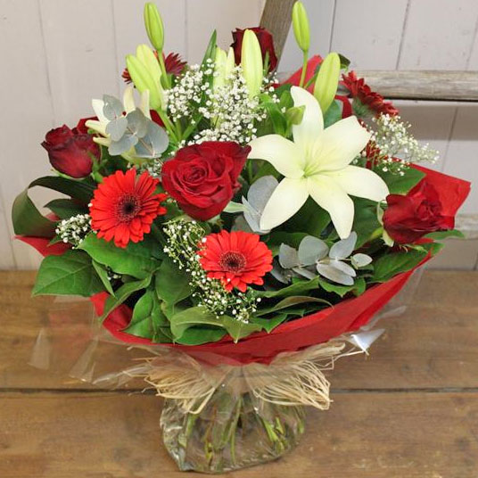 Red Roses White Lilies Gyp Red Gerbera Mixed foliage