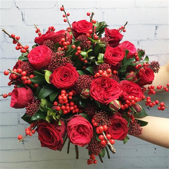 Red Roses Red Ilex Berries Skimmia Japonica Mixed foliage