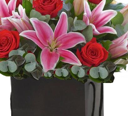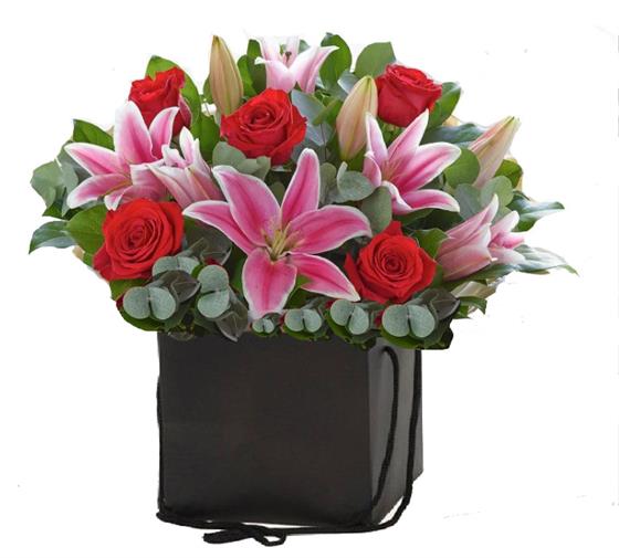 5 x Red Roses 2 x Pink Lilies Mixed Foliage