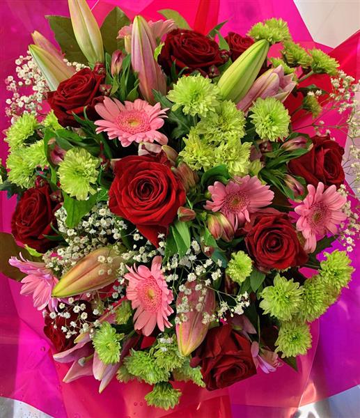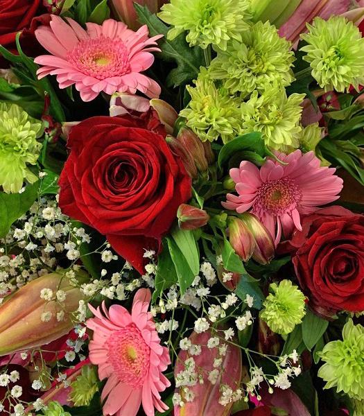 Red Roses Pink Gerbera Gyp Pink Alstromeria Green Spray Chrysanthemums