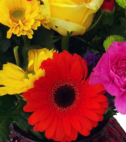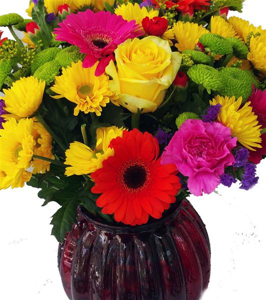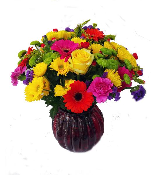 Yellow Roses Green Spray Chrysanthemums Cerise Germini Red Spray Carnations Yellow Spray Chrysanthemums Hot Pink Bloom carnations Orange Gerbera