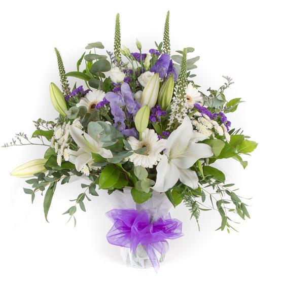 White Gerbera White Lilies Purple Statice Purple Lisianthus