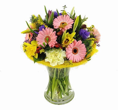 Pink Gerbera Daffodils Tulips Blue Statice Green Carnations Yellow Solidago