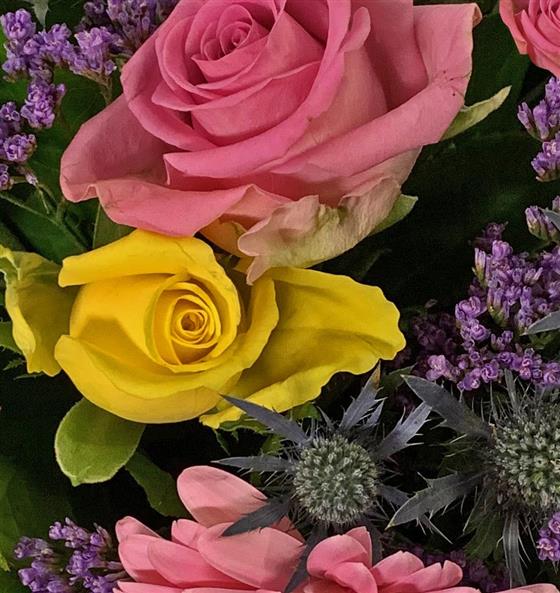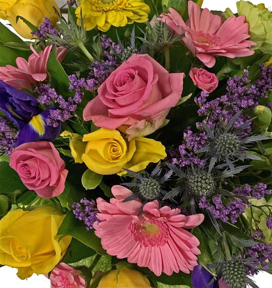 Yellow Roses Pink Gerbera Purple Statice Iris Green Bloom Carnations Blue Eryngium