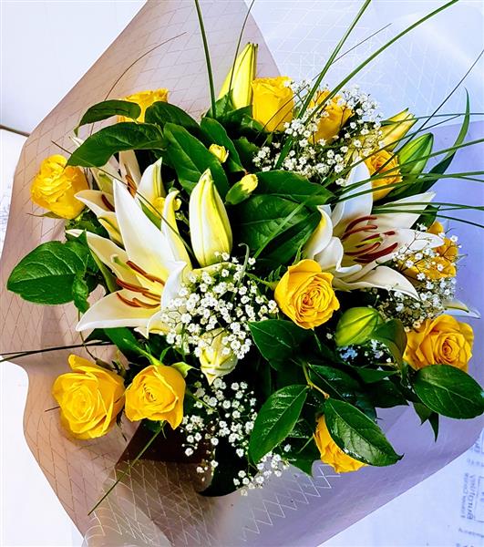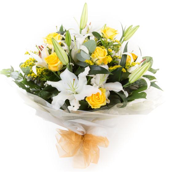 Yellow Roses White Lilies Yellow Solidago Mixed Foliage