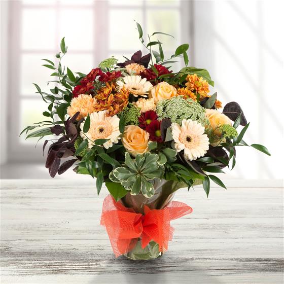 Peach Gerbera Peach Roses Burgundy Spray Chrysanthemums Mixed Foliage
