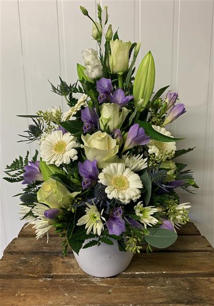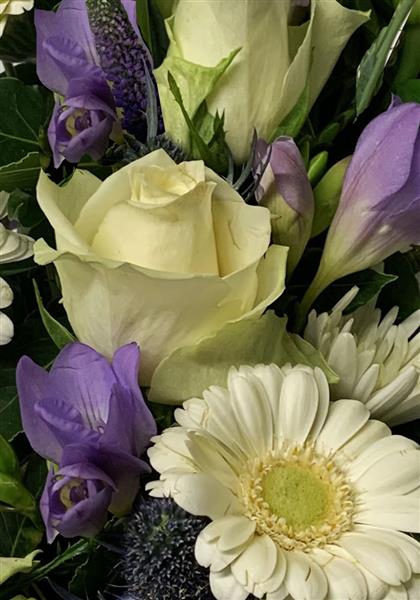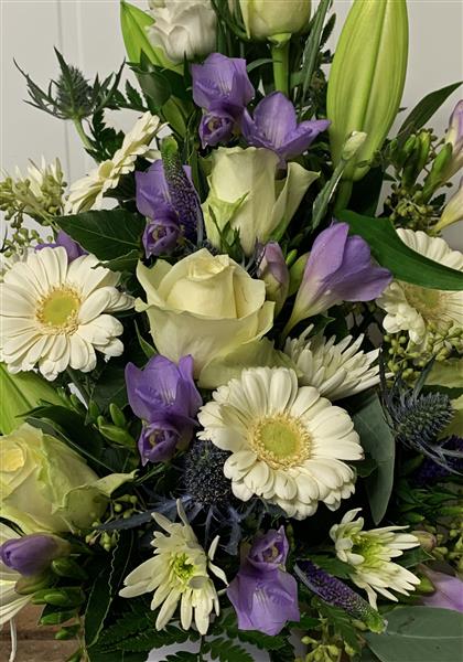Purple Lisianthus White Spray Carnation White Spray Chrysanthemum Purple Freesia Lilac September Flower & Mixed Foliage